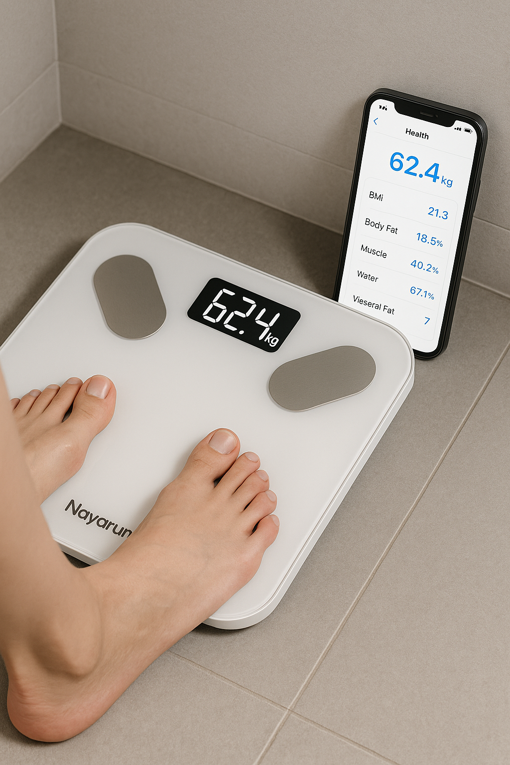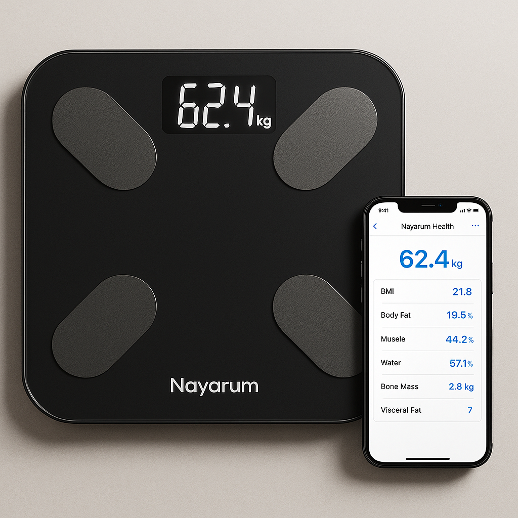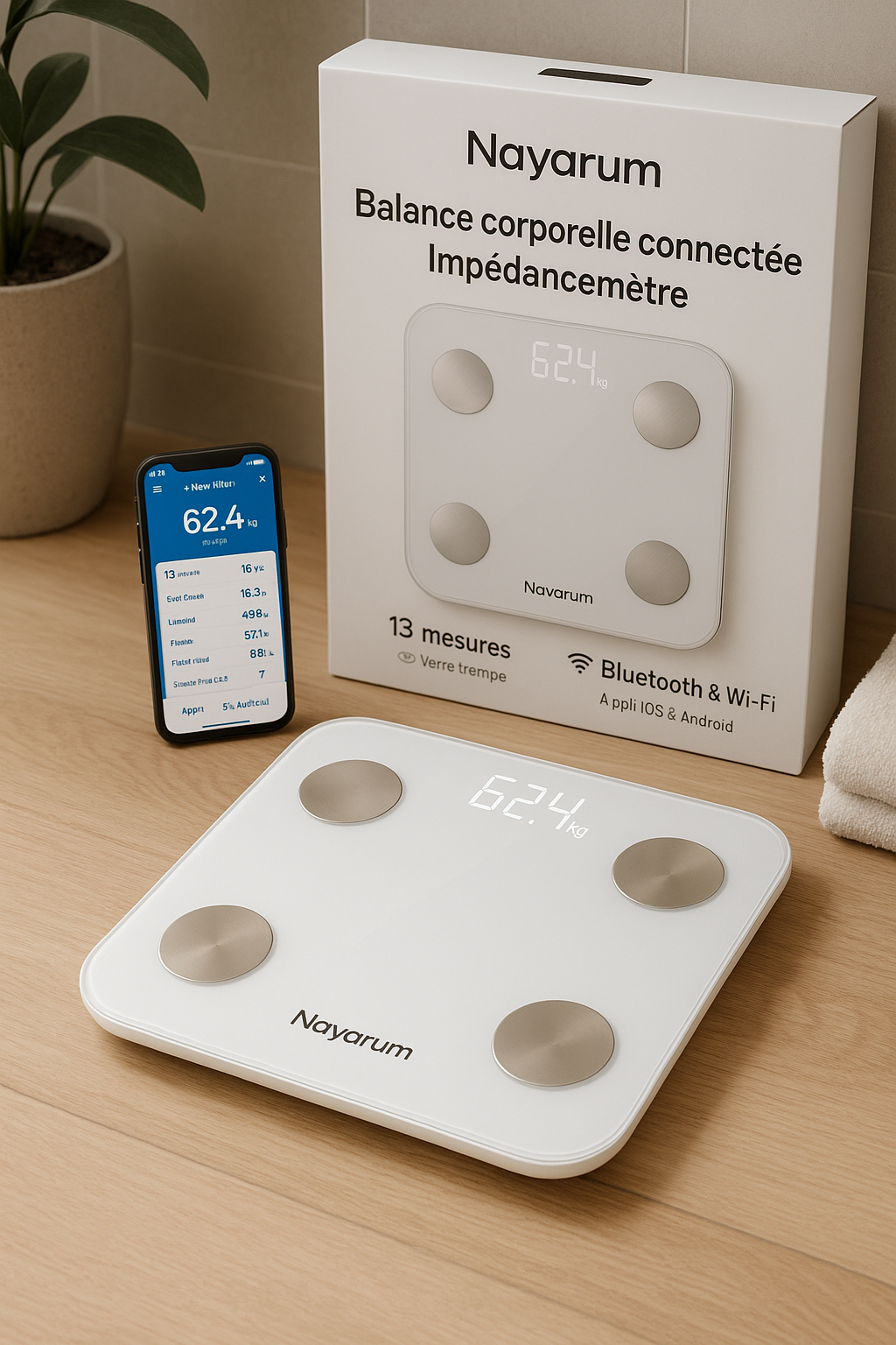 La Nayarum met la bio-impédance professionnelle à portée de tous. En quelques secondes, elle estime votre composition corporelle et alimente des courbes d’évolution claires pour suivre vos objectifs (perte de poids, prise de masse, recomposition). Grâce au Wi-Fi, vos mesures se synchronisent en arrière-plan : pesez-vous, c’est enregistré. L’app Nayarum Health centralise vos tendances, compare vos semaines, fixe des rappels et permet de partager (ou pas) vos progrès avec votre coach ou votre médecin.