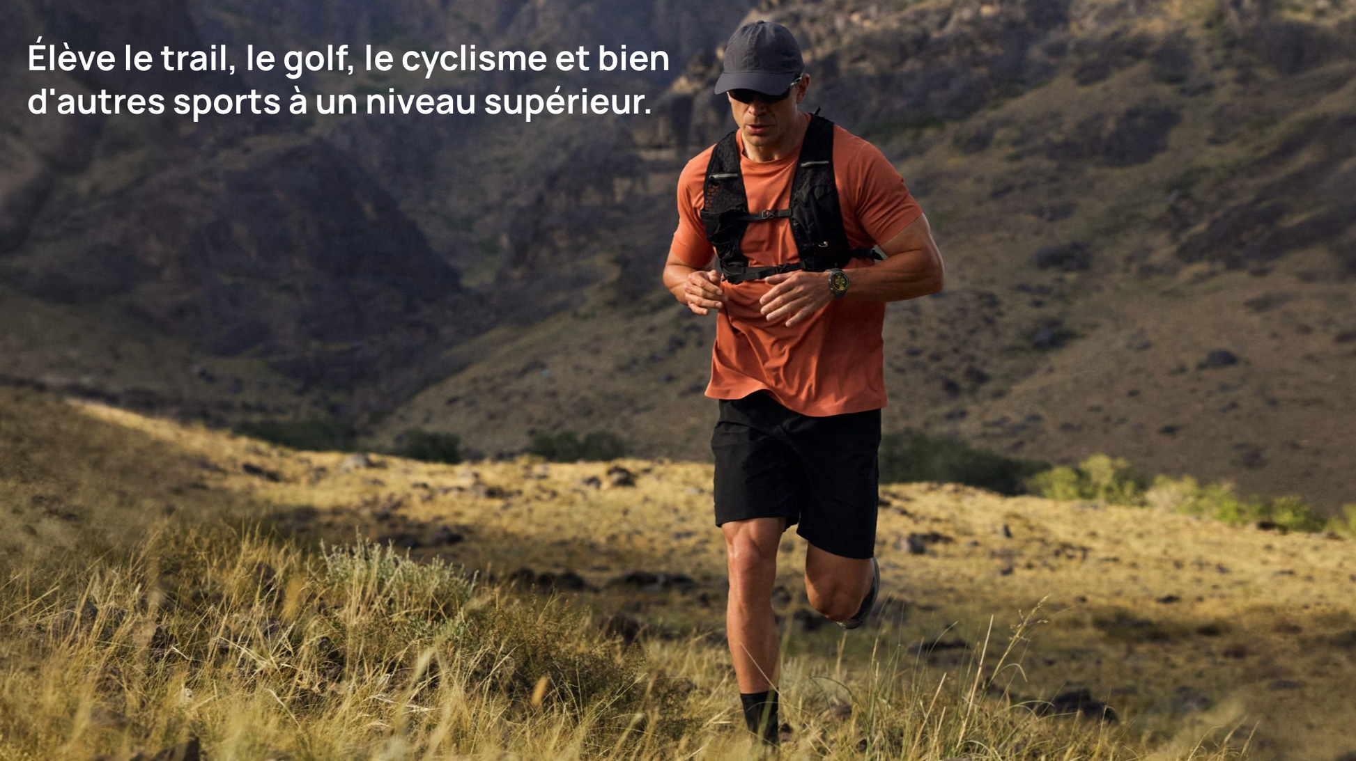 L'autonomie de la batterie en mode sport en extérieur est testée dans les conditions suivantes: paramètres d'usine par défaut, GNSS toujours activé, surveillance de la fréquence cardiaque toujours activée, écran de l'appareil allumé 90 fois par heure, notifications par vibration 12 fois par heure.